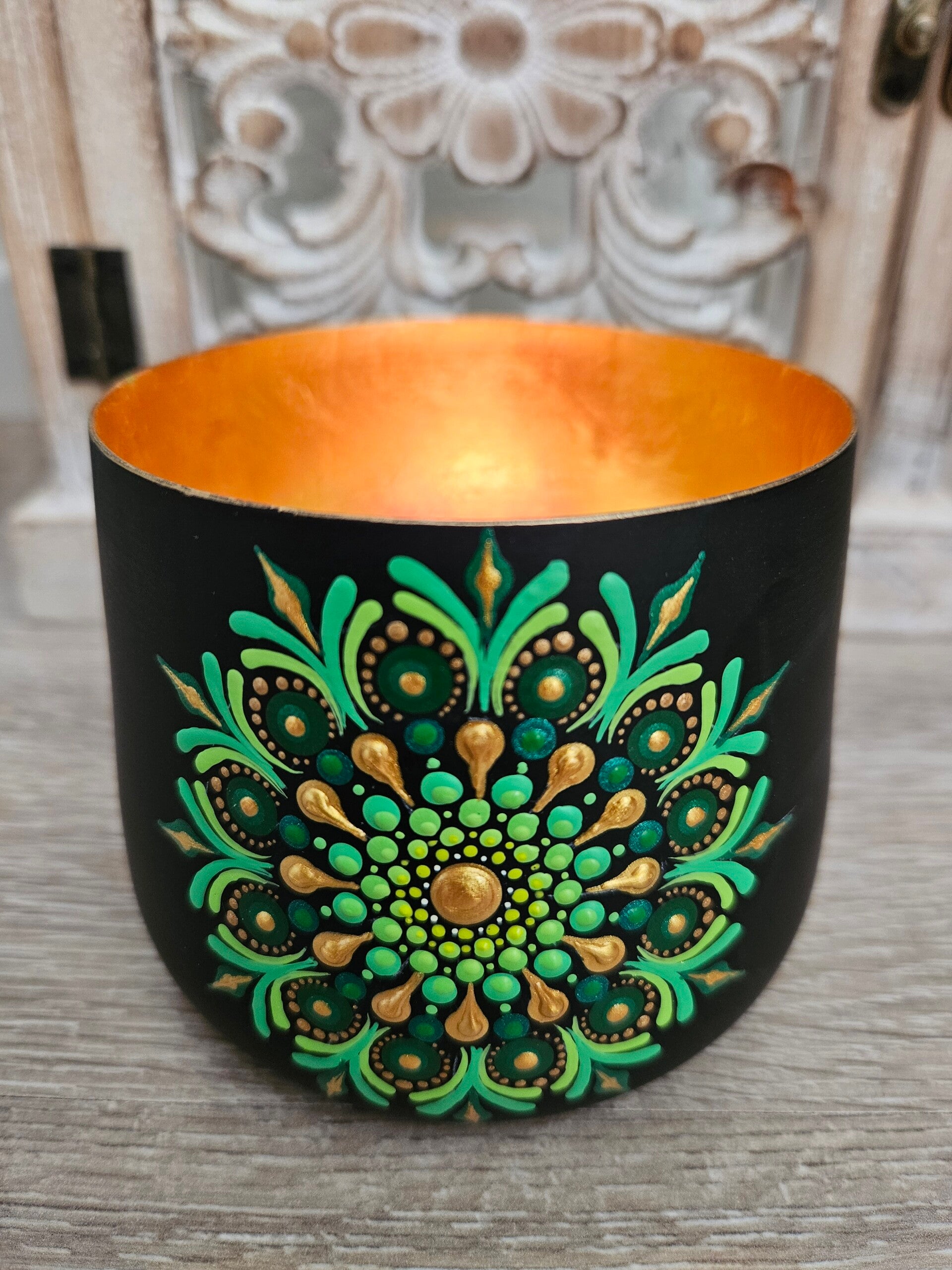 Mit viel Liebe und Geduld wurde dieses Windlicht kreiert. Die goldige Innenseite wird bei Kerzenlicht schön ausgeleuchtet.